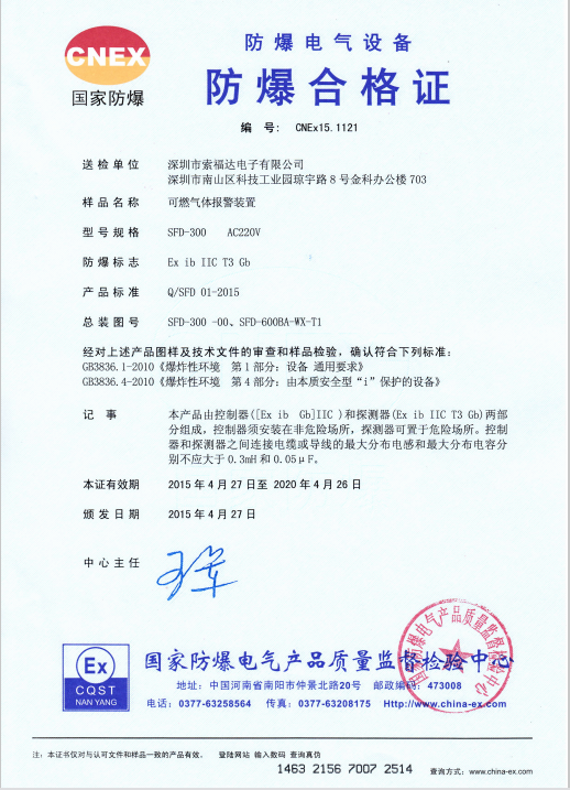我公司送檢的點(diǎn)型可燃?xì)怏w探測器、報(bào)警控制器,經(jīng)國家防爆電器產(chǎn)品質(zhì)量監(jiān)督中心的樣品檢驗(yàn),符合以下標(biāo)準(zhǔn): GB3836.1-2010《爆炸性環(huán)境第1部分:設(shè)備通用要求》、GB3836.2-2010《爆炸性環(huán)境第2部分:由隔爆外殼“d”保護(hù)的設(shè)備》、GB3836.4-2010《爆炸性環(huán)境第4部分:由本質(zhì)安全型“i”保護(hù)的設(shè)備》,取得了2015版防爆合格證。