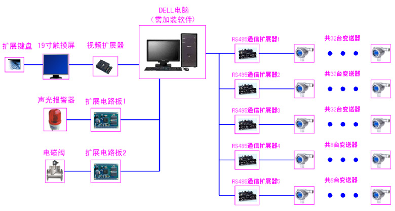 備注: 系統(tǒng)每個回路最大容量可控制1040只可燃、毒性氣體變送器,5個RS485通信擴展器一共可安裝160臺變送器,以備后續(xù)增加用擴展電路板2和電磁閥為備用.